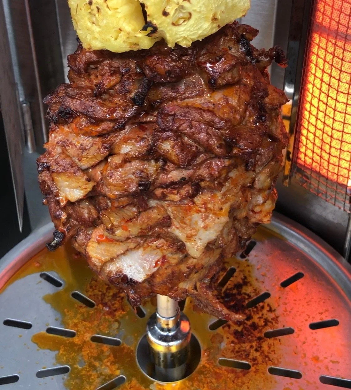 The introduction and refinement of the vertical rotisserie (trompo) technology was crucial to al pastor's development and popularity. In Mexico, this vertical spit became known as a "trompo" - literally meaning "spinning top" in Spanish. The vertical orientation offered several technological advantages over traditional horizontal spits: