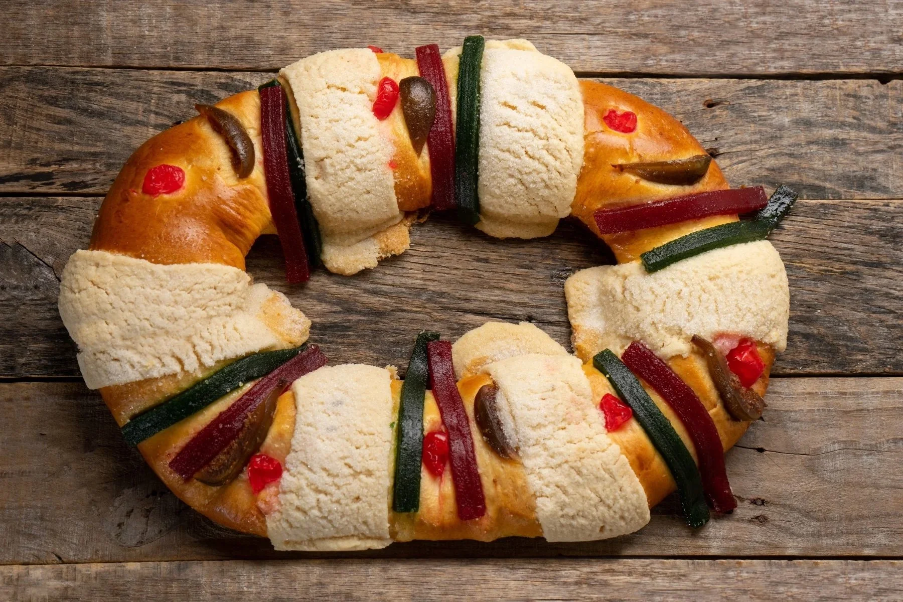 On January 6, families gather to share a sweet, wreath-shaped bread dotted with jewel-like candied fruit. The circular loaf honors the Three Wise Men and symbolizes God's endless love; the candied fruit represents the kings' gifts. Hidden inside are one or more tiny figurines of the infant Jesus. Finding a figurine ensures good luck but also assigns the finder to host a tamale feast on February 2, Día de la Candelaria. Modern panaderías sometimes tuck several babies inside one rosca, guaranteeing multiple hosts and more tamales the following month. The bread's tender, egg-rich crumb is often scented with orange zest and anise, turning the simple act of slicing into a ritual of aroma and suspense.