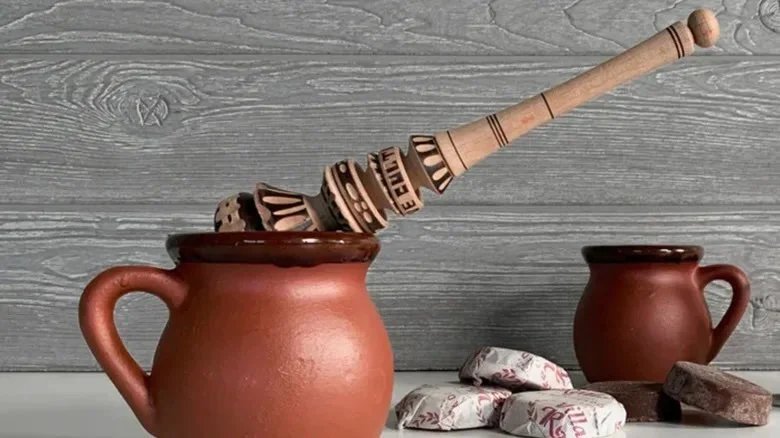 The molinillo is a traditional Mexican wooden whisk, hand-carved and often beautifully decorated, used to froth hot beverages like chocolate caliente and champurrado. Invented in colonial-era Mexico, it replaced earlier methods of whisking cacao drinks by hand, making it easier to achieve the signature foamy top prized in Mesoamerican chocolate traditions. To use it, the molinillo is placed between the palms and rolled back and forth, spinning in the pot or mug to blend ingredients and create froth. Beyond its practicality, the molinillo carries cultural significance—many families pass them down through generations as cherished kitchen heirlooms. Its rhythmic motion, creaking wood, and the rising aroma of chocolate create an experience that connects the drinker to centuries of tradition.